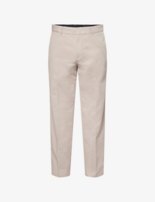 Emporio Armani stretch-cotton trousers99% cotton, 1% elastane; lining 65% polyester, 35% cottonConcealed button, hook-and-eye and zip-fly fastening at frontRegular fit, mid rise, tapered leg, structured waistband with belt loops, two side slip pockets, two rear welt pockets, pressed creases at leg, silver-toned logo plaque at backMachine wash at 30°CSize UK 32: rise 12in / 30cm, inside leg 32in / 81cm, leg opening 14in / 36cmModel is 6ft 2in/1.88m and wears a size UK 32Lightweight, non-stretch