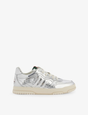 Gucci leather trainers100% leatherLace-up fasteningRound toe, brand stripe trim at tongue, debossed brand monogram pattern, brand patch at back, contrast soleHeel height 1.3’Specialist leather cleanMade in ItalyUpper: 100% leatherLining: 100% leatherSole: 100% rubberAdditional laces includedPresented in a box, comes with a dust bag