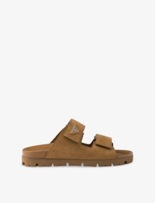 Prada suede sandals100% suedeHook-and-loop tape fasteningOpen round toe, double hoop and loop straps, enamelled metal triangle logo, rubber sole with tire-patterned treadSpecialist leather cleanUpper: 100% suedeLining: 100% leatherSole: 100% rubber
