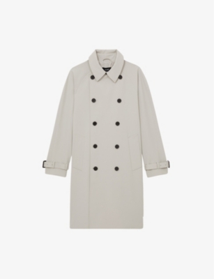 Reiss woven trench coat86% nylon, 14% elastane; contrast 100% polyesterButton fasteningRegular fit, double breasted, long sleeves, slip pockets at front, contrast buttons, long lengthDry clean onlyModel is 6ft 2in/1.88m and wears a size mediumLightweight, non-stretch