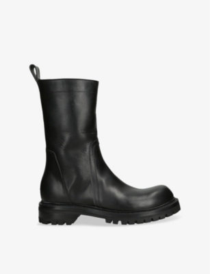 Rick Owens leather ankle boots100% leatherZip fasteningClosed round toe, oversized toe cap, ankle length, pull tab at heel, chunky tread soleSpecialist leather cleanMade in ItalyUpper: 100% leatherLining: 100% leatherSole: 100% rubber