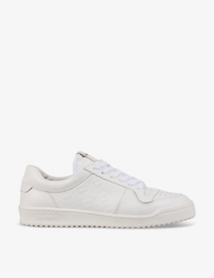 Sandro leather trainers100% leatherLace-up fasteningRound closed toe, geometric pattern at the side, logo embossed at the tongue, low-top silhouetteSpecialist leather cleanMade in ItalyUpper: 100% leatherLining: 100% textileSole: 100% rubber