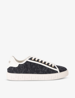 Drapery, decadence and a frisson of danger – since 1978, Versace has orchestrated an operatic fantasy with its waist-nipping leathers and diaphanous, sequin-dusted designs that cascade over every curve like a whisper. The label’s latest antique-inspired creation? The Baroque trainers. Plucked from the house’s SS24 collection, they’re crafted from smooth canvas, engraved with the label’s unmistakable Grecca pattern along the sole and patterned with opening blooms entwined with noble acanthus leaves.Versace canvas low-top trainers100% canvasLace-up fasteningClosed toe, round toe, all-over Baroque pattern, gold-toned hardware, branded tongue, foiled branding at heel, engraved Greca pattern, branded insoleWipe with a clean, dry clothMade in ItalyUpper: 100% canvasLining: 100% canvasSole: 100% rubber