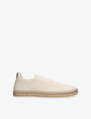 Ermenegildo Zegna woven low-top trainers100% canvasLow top, round closed toe, slip-on, triple-crossing elastic laces, heel pull tab, brand-embossed tongue, contrast soleWipe with a clean, dry clothUpper: 50% leather, 50% fabricLining: 100% leatherSole: 100% synthetic